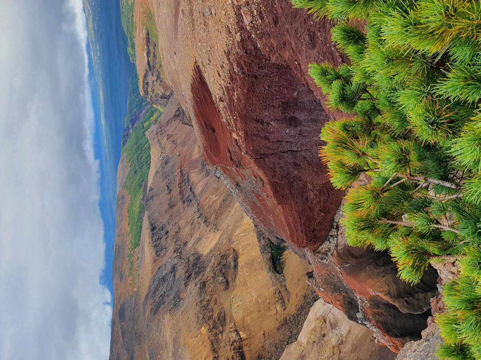Его называют Красный обрыв или Красный Конус. Когда-то его тоже «распилила» р. Вулканная, и теперь меньшая часть постройки находится на левом склоне, а большая – на правом борту Опасного. Именно на этом остатке побочного конуса мы обычно находимся